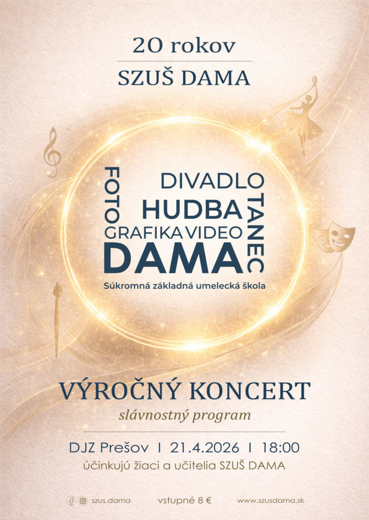 Súkromná základná umelecká škola DAMA si v tomto roku pripomína významné jubileum – 20 rokov svojej činnosti. Pri tejto príležitosti Vás srdečne pozývame na slávnostný výročný koncert, ktorý je oslavou tvorivosti, talentu a umeleckého rastu našich žiakov.